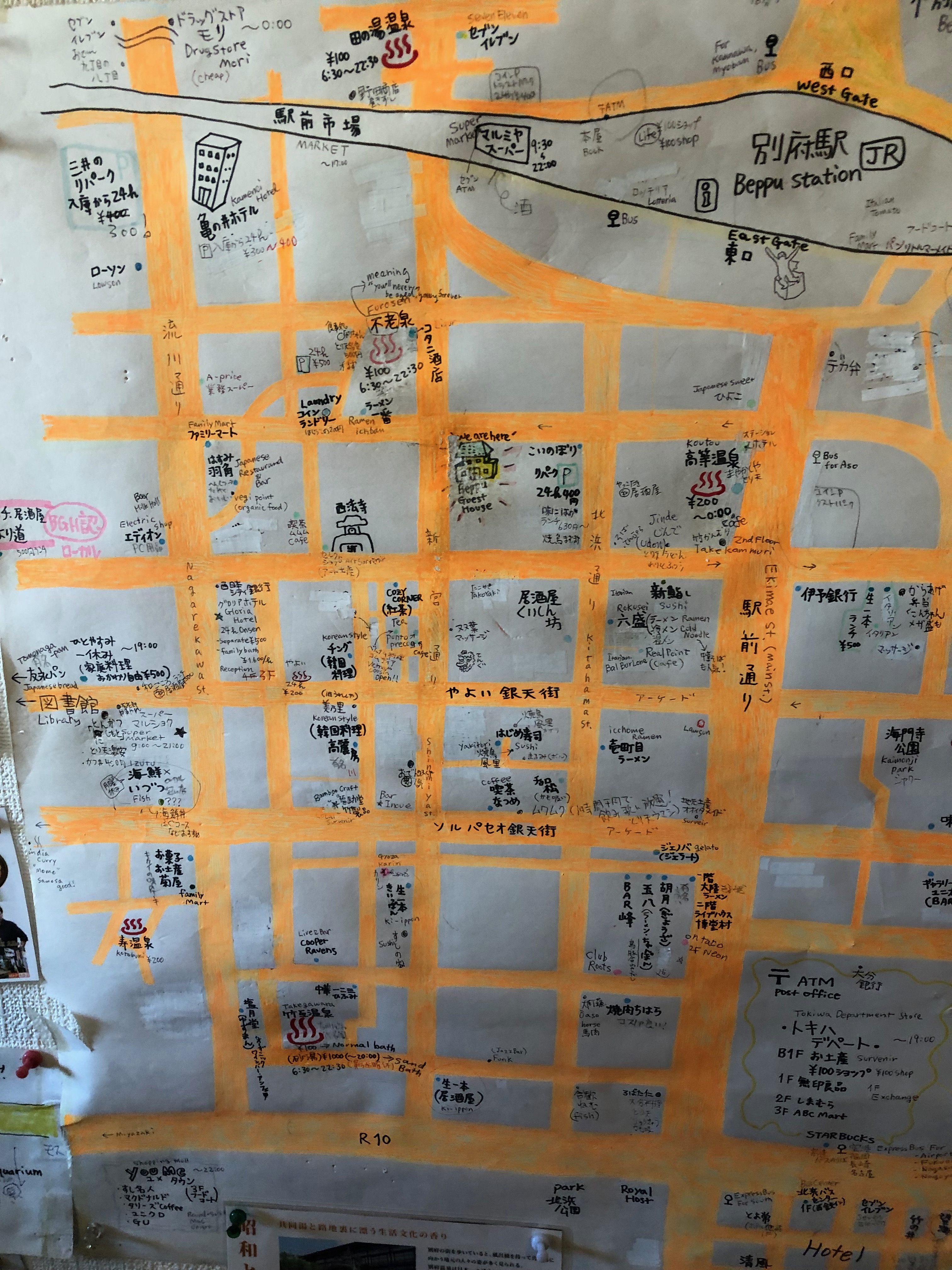ゲストハウスの方に、手書きの地図で温泉と飲食店のおすすめを教えてもらいました。
